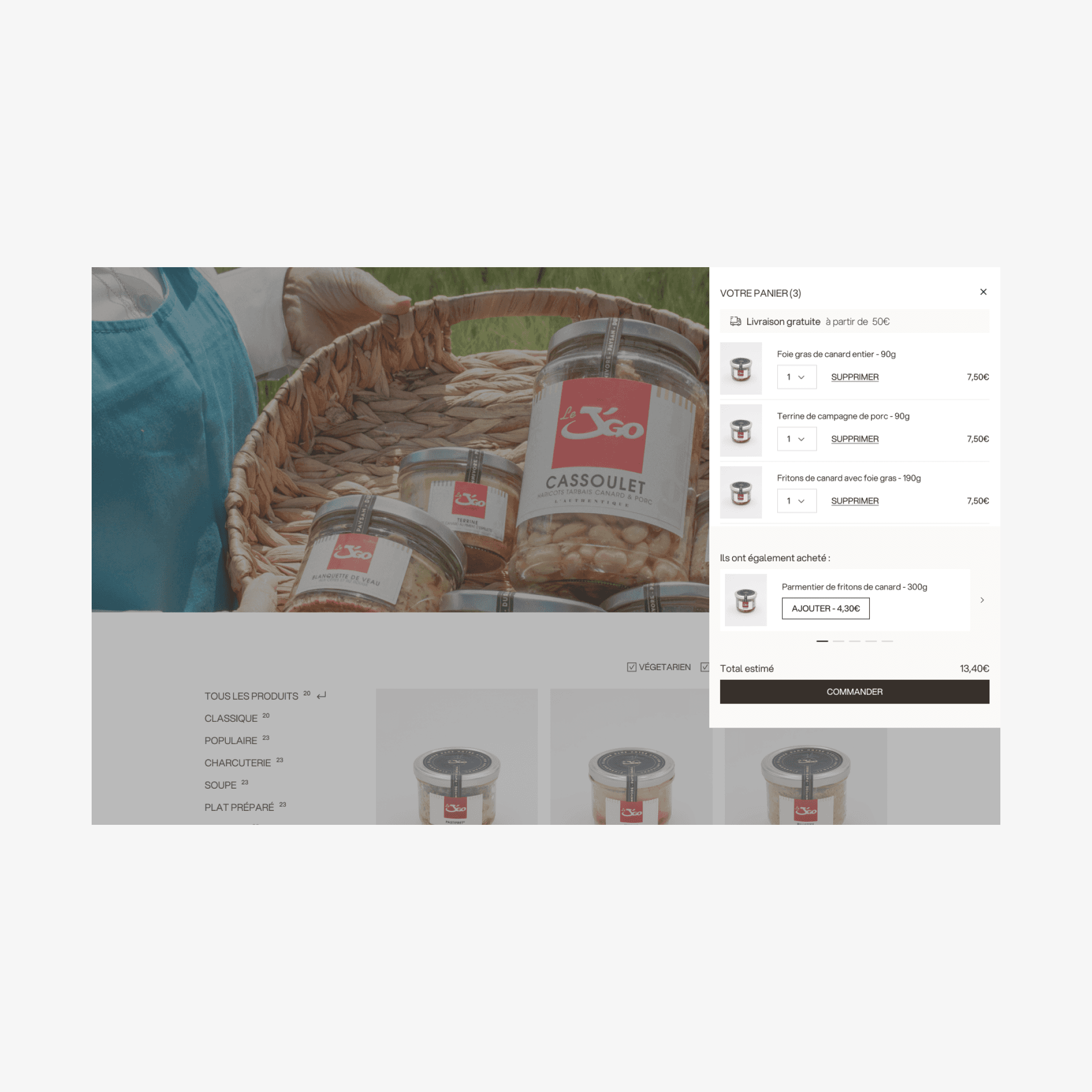 Le J’Go célèbre le terroir français avec des produits d’exception issus d’un savoir-faire artisanal. En tant que plateforme e-commerce, elle met en valeur les saveurs les plus raffinées avec passion et précision, pour les amateurs de gastronomie authentique.