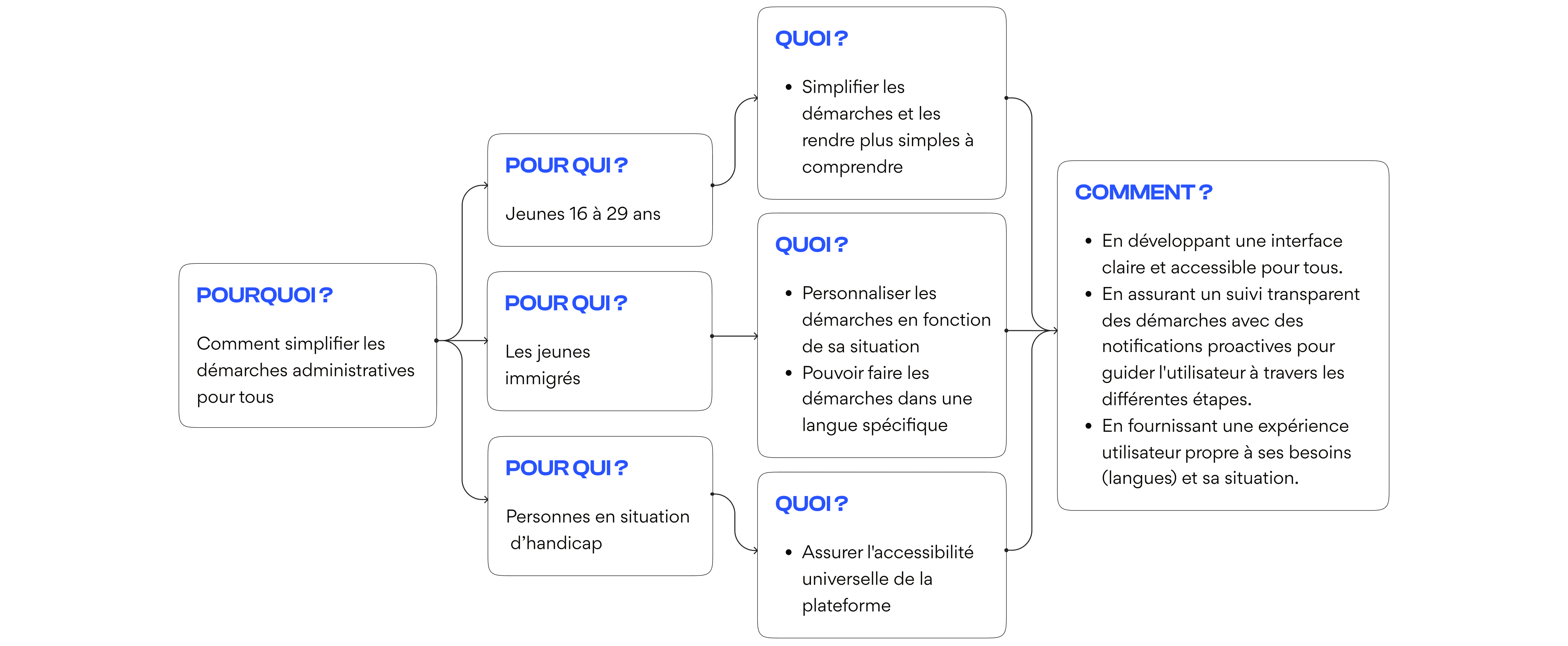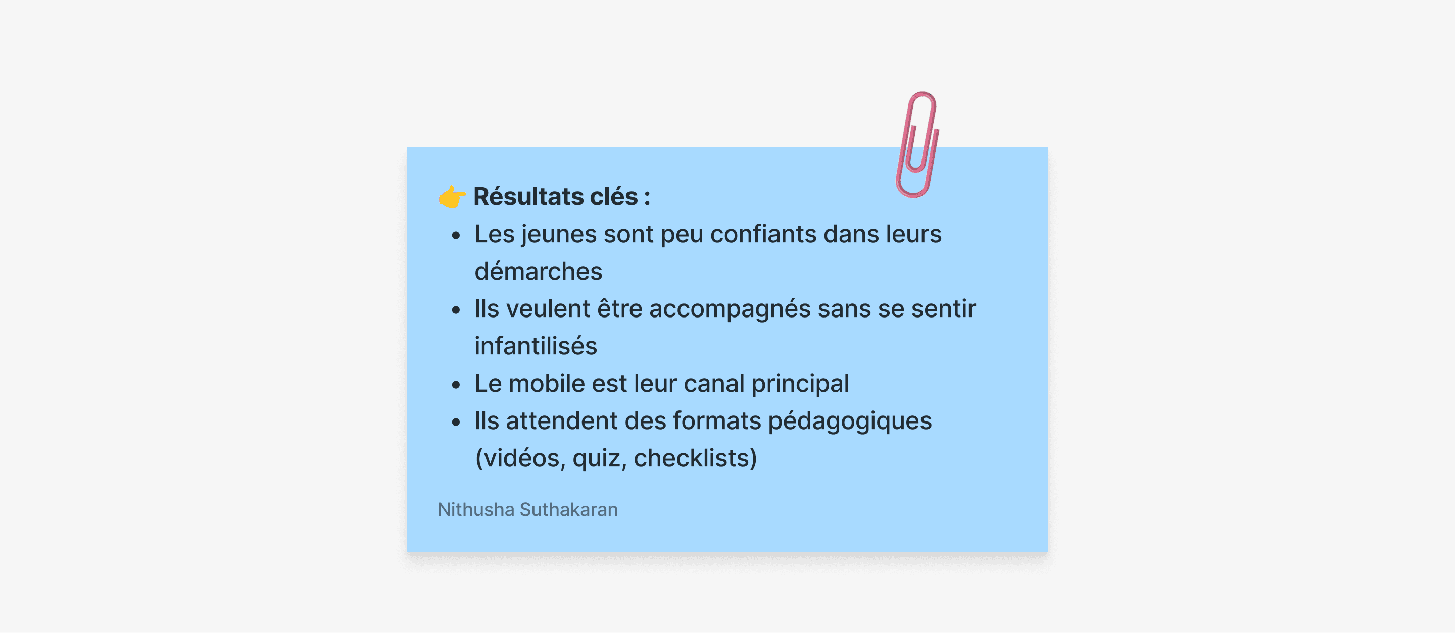 J’ai réalisé des entretiens et des sondages auprès de jeunes de 18 à 30 ans, dont les insights ont servi à créer un parcours clair et pédagogique. J’ai suivi une méthodologie en quatre phases, inspirée du design produit et validée par les utilisateurs.